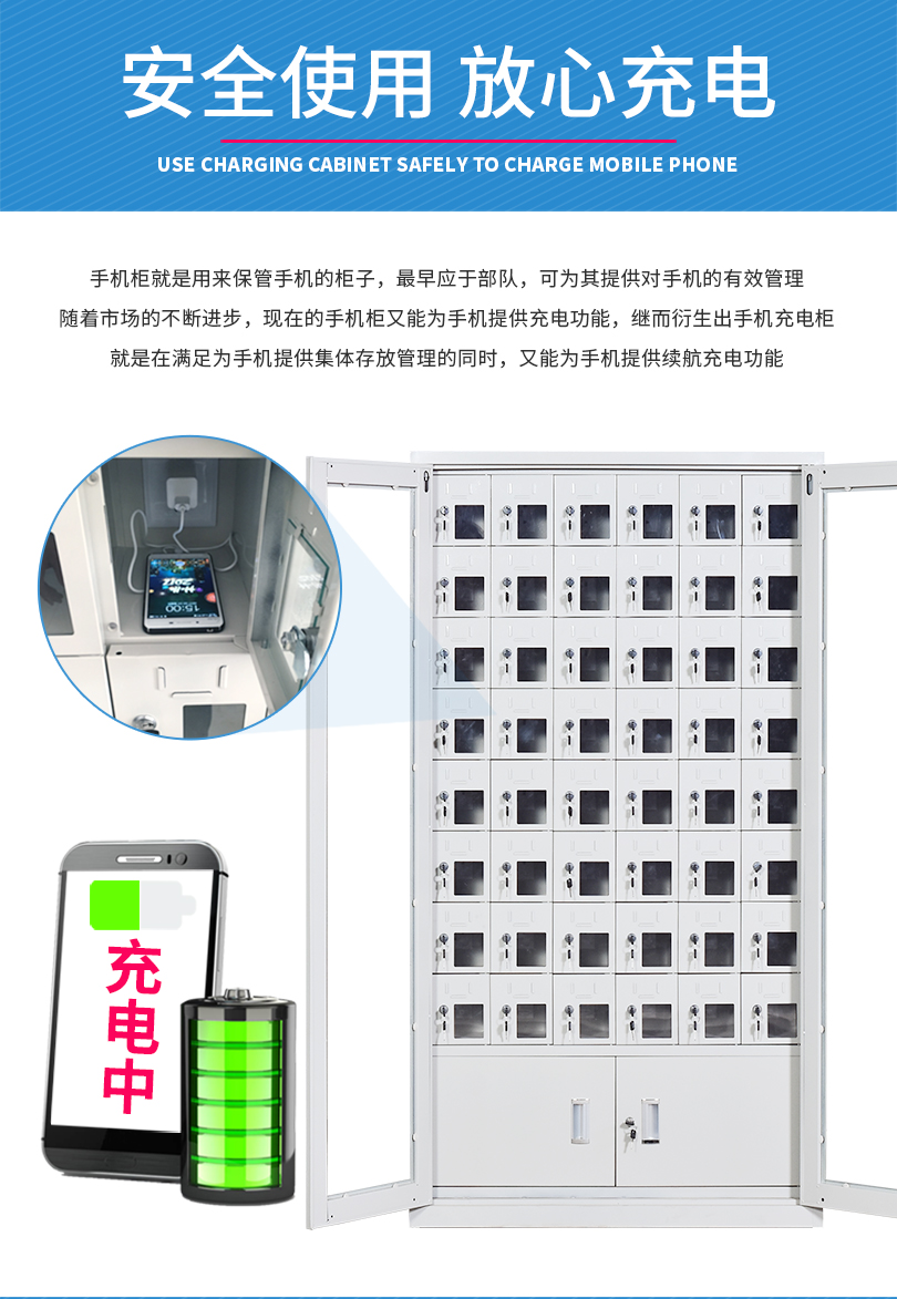 手機保密柜正面為對開金屬邊框玻璃大門,便于觀察柜內(nèi)情況,堅固透亮,美觀大方。